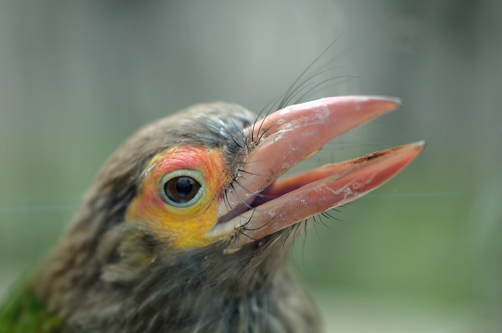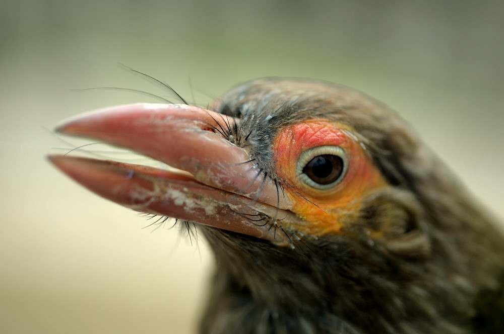 The brown headed barbet is widespread in India. It is fairly tolerant of humans and is often seen in cities. These clicks are from my window in Delhi. It nests in a tree hole, laying 2-4 eggs. The bird is largely frugivorous. This is a relatively large barbet at 27 cm, a plump bird, with short neck, large head. The adult has a streaked brown head, neck and breast, with a yellow eye patch.