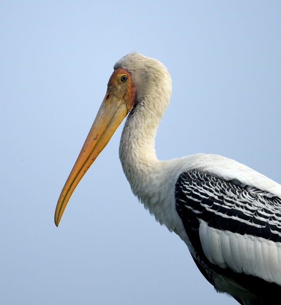Painted Storks are beautiful birds with long, yellow orange bill, a vivid yellow orange face, and pink legs. This bird has an incredibly long neck which is stretched during its elegant, soaring flight. It looks beautiful with its wings fully stretched in flight and during landing or take off. The Painted stork is a colonial nester and often nests in mixed colonies with other waterbirds, such as storks, ibises and herons.