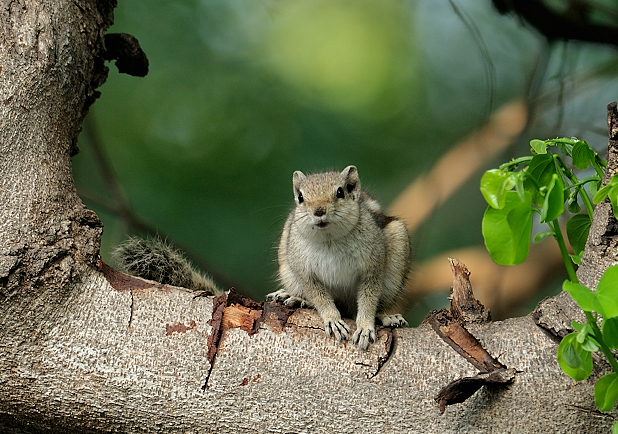 The Palm squirrel has a bushy tail, slightly shorter than its body. The back is a grey-brown in colour with three conspicuous white stripes which run from head to tail. The two outer stripes run from the forelegs to the hind legs only.