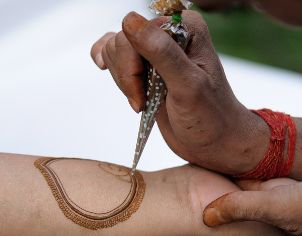 Dried henna leaves(Lawsonia inermis, plant) are mashed into a paste. This paste is then applied to the palms and the feet. A few decades ago the paste was applied with the help of the plain side of a matchstick. These days a plastic cone is usually used to apply the Henna paste. A light orangish colour can be achieved within minutes, but to achieve a dark colour the paste has to be left on the skin for a longer time. The dried paste is often dabbed with a sugar/lemon mix to get a dark colour. After some time the dry paste is scraped away.