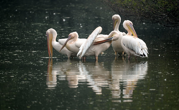 Pelicans are among the largest flying birds and are famous for their huge throat pouches. It uses its pouch and long bill to scoop up fish. Pelicans live around lakes, rivers, and other water sources. They often fish and fly in small groups.