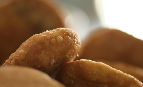 “I will make a few different shapes for you, for the guests I will stick to the traditional shape.” She made the perfect crescent shaped dahi gujhiyas. One by one, a spoon full of lentil paste was spread on a wet muslin cloth, a few broken pieces of cashews and kishmish were added to it and the gujhiyas were gently released into the oil, one by one and fried, till they turned golden brown.