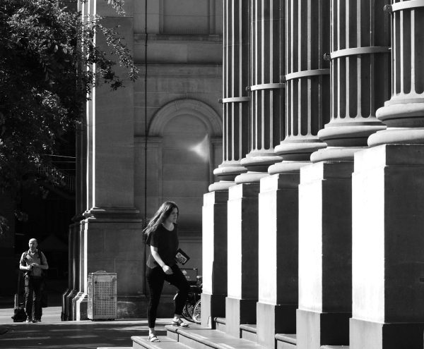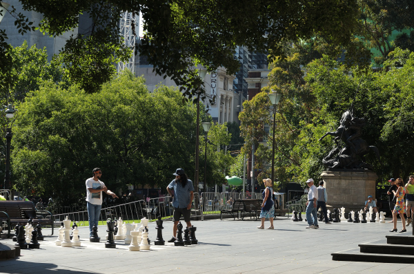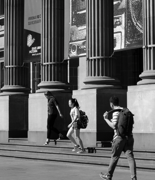 The lawn in front of the library’s main entrance on Swanston Street is a popular lunch-spot for the city’s workers and students.