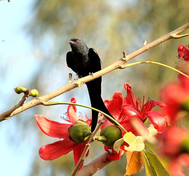 After that visit to Bharatpur, I clicked pictures of the Black Drongos many times. I didn’t have to travel outside Delhi to see them. This glossy black bird with a distinctive forked tail can be easily identified. I saw them perched on branches of trees and on electric wires. I saw them on Semul trees, perched on branches laden with bright red Semul flowers.
