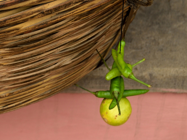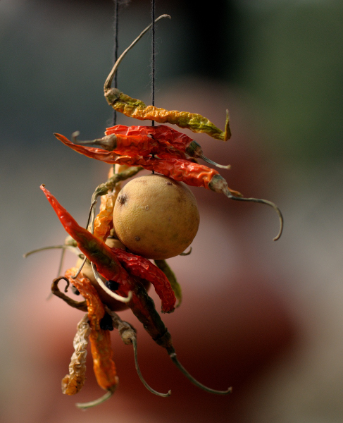 A lemon with chillies tied together, hanging outside small shops to protect the business from an evil eye, is a common sight. Once I saw a modern version of lemon and chilly string, it was made of plastic. I wonder if it is considered as effective as the time-tested natural version.