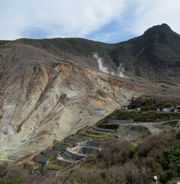 Owakudani Valley, situated in the Hakone region west of Tokyo, is a popular tourist destination in Japan. It is renowned for its distinctive sulfuric smell, steam vents, and breathtaking views of Mount Fuji. The terrain is rocky and tinged in shades of ochre and grey. There is steam pouring up through vents scattered around the mountain. Owakudani translates to “Great Boiling Valley.”
