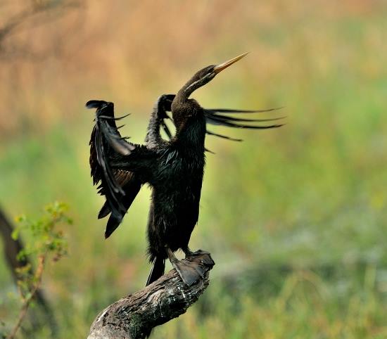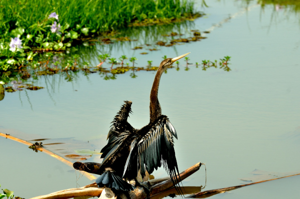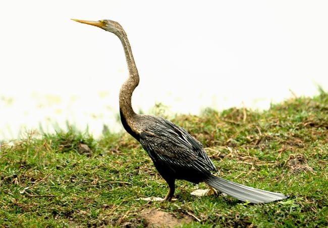 Anhinga is a long-tailed water bird with dark, glossy wings and a long, snake-like neck. Most other waterbirds have three toes, but Anhingas, like cormorants and pelicans, have four webbed toes.