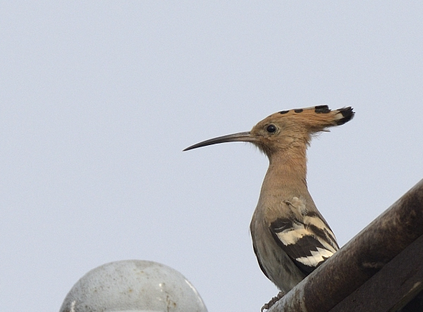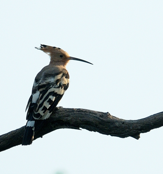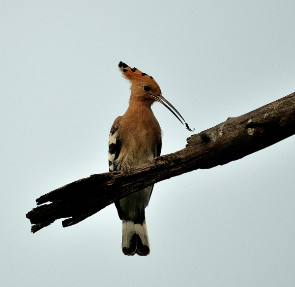The hoopoe is an exotic-looking, orange bird with zebra-striped wings. Its crest is like a fan, which is usually closed, but often raised just after landing. The bill is black and downcurved. Male and female hoopoes have identical plumage, but the female is slightly duller than her mate.