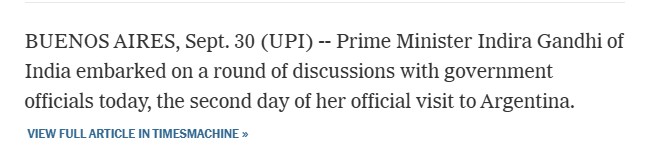 “In September 1968, Indira Gandhi visited Argentina. Her visit was widely covered by international media. She met Victoria Ocampo in Buenos Aires and conferred on her the honorary degree of Doctor of Literature of Visva-Bharati University.