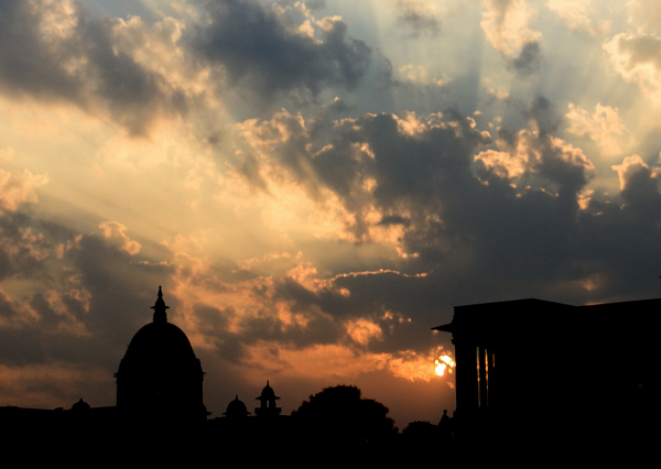 The late-afternoon sky turns a deep orange-yellow during the monsoon season.
