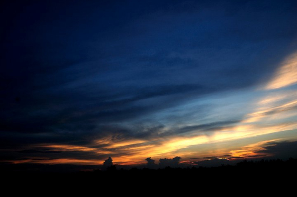The late-afternoon sky turns a deep orange-yellow during the monsoon season.