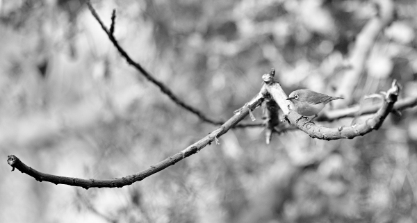Sometimes colours distract; if this were a coloured picture, the attention would be drawn to the bright yellow of the Oriental White Eye and not the curved branches of the tree.