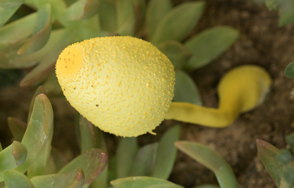 A sudden appearance of a yellow mushroom, in the shape of a small club or a bowling pin, in your pot might surprise you. This could be the flowerpot parasol (Leucocoprinus birnbaumii), a fungus found in potted plants. Also known as the yellow houseplant mushroom or plant pot dapperling, these small, lemon-yellow mushrooms are about 1 to 3 inches tall. Their bell-shaped or oval caps are 1 to 2 inches in size. They may appear single or in clusters.