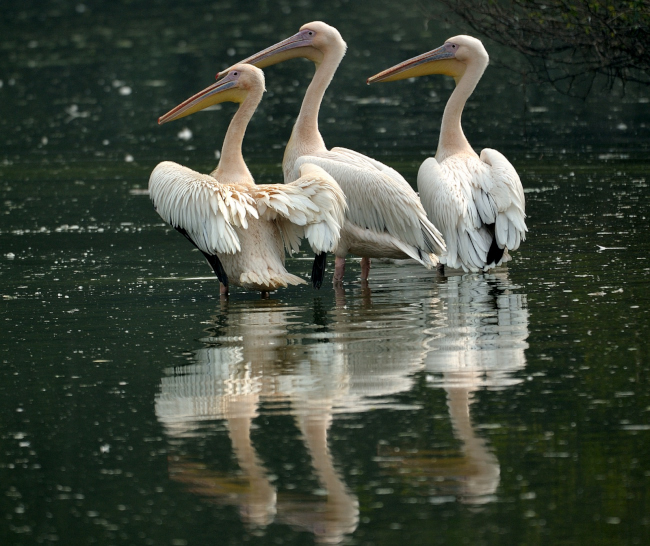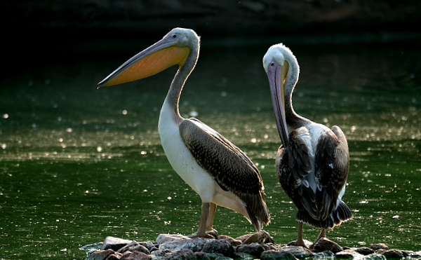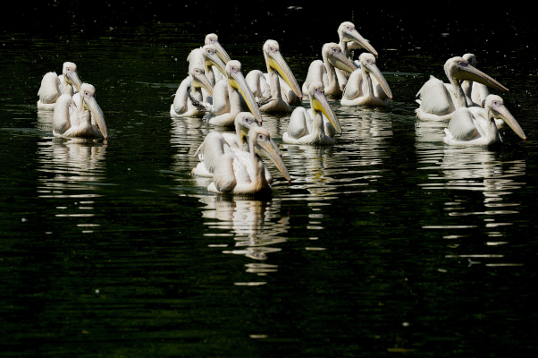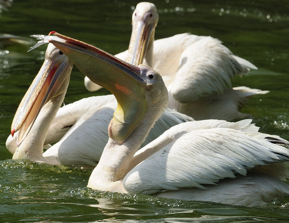 Pelicans are not just about pouches. They are beautiful birds, mostly white or light grey in colour, with some featuring black or dark grey flight feathers on their wings. There are some brown and pink-backed pelican species, though. They are large waterbirds with short legs and fully webbed(totipalmate) feet. All four toes are connected by webbing. Not great for walking, but they help make them excellent swimmers. No wonder pelicans spend most of their time on or near water. They are mostly silent, not noisy.