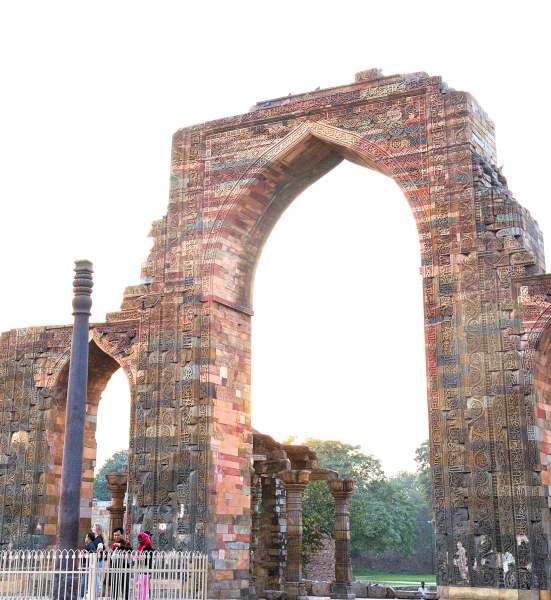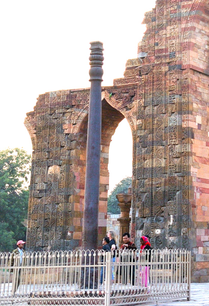 An iron pillar stands in the courtyard of the Jami Masjid. The pillar has remained corrosion-resistant and rust-free for over 1,600 years of its existence. Dating back to the Gupta Empire (5th century CE), it predates the Qutub Minar by over 800 years. It is believed that if a person stands with their back to the structure and clasps their hands while putting their arms around it, their wish will be fulfilled. A fence has been erected around it to prevent erosion by the physical touch of countless visitors to the monument. The pillar weighs more than six tons and is approximately 23.6 feet tall, with 3.6 feet of it buried below the ground.