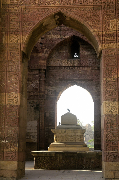 The square tomb of Iltutmish, in the Qutub complex. The tomb chamber is carved with Quranic calligraphy and geometric patterns.